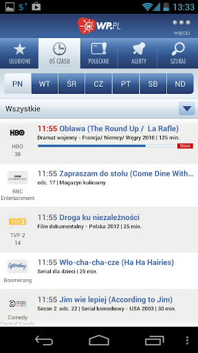 - oś czasu na 7 dni tygodnia – prezentuje programy wg czasu emisji z listy ulubionych stacji